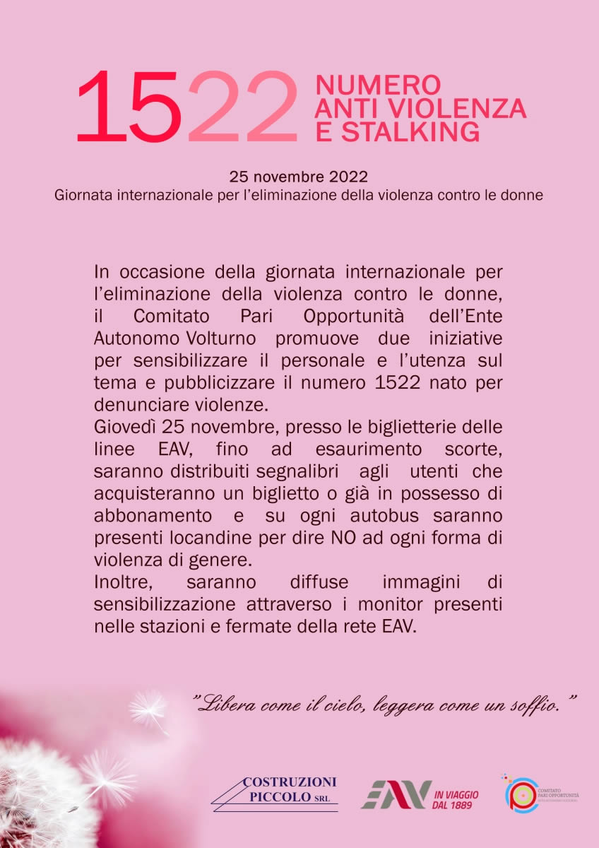 In occasione della giornata internazionale per l’eliminazione della violenza contro le donne il Comitato Pari Opportunità dell’Ente Autonomo Volturno promuove due iniziative per sensibilizzare il personale e l’utenze sul tema e pubblicizzare il numero 1522 nato per denunciare le violenze.