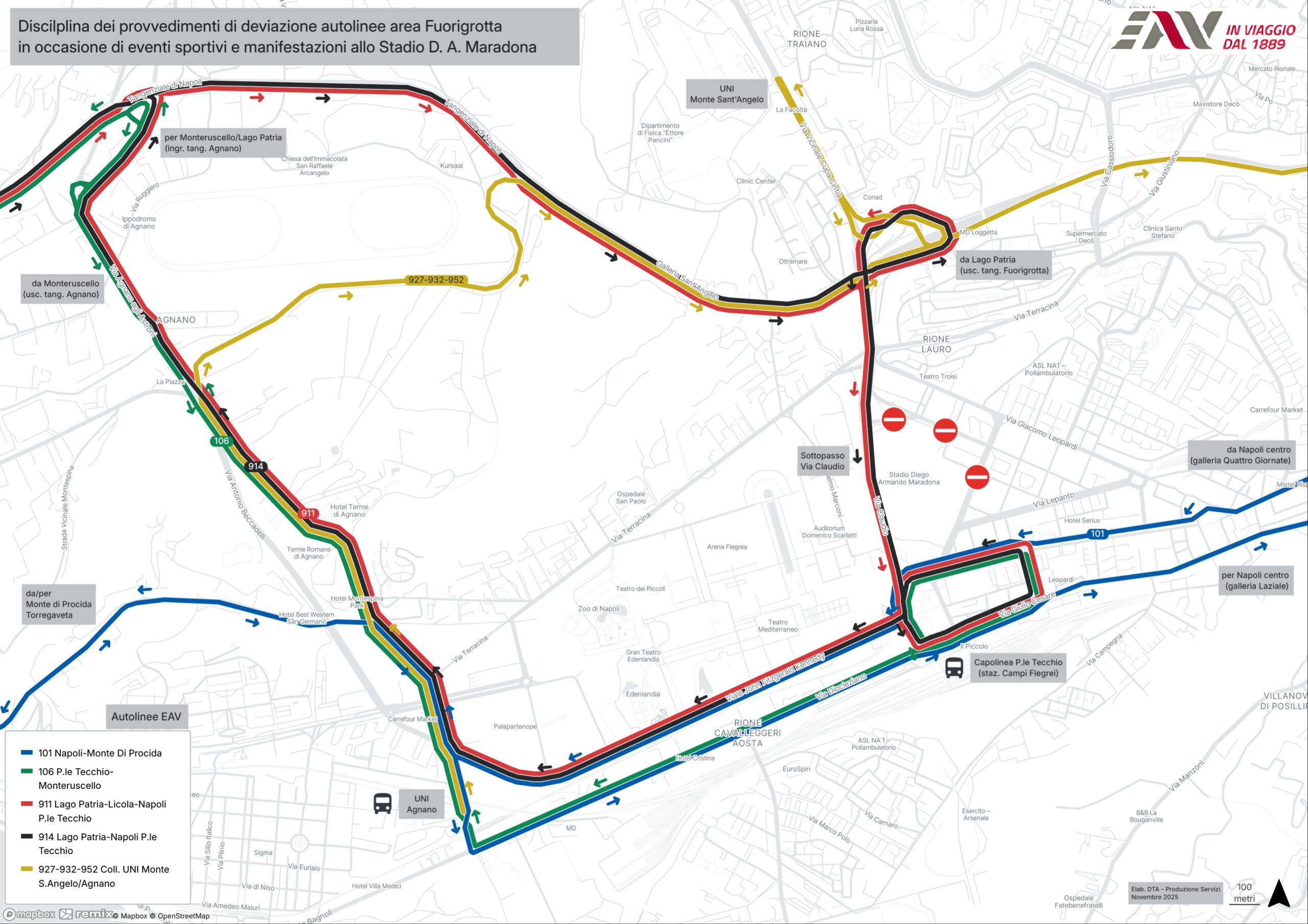 Si informa la Clientela che, in concomitanza degli eventi sportivi e spettacoli in programma allo stadio D.A. Maradona di Napoli, per particolare dispositivo di traffico nella zona di Fuorigrotta prima e dopo l’evento, i servizi interessati effettueranno deviazioni di percorso come indicato: