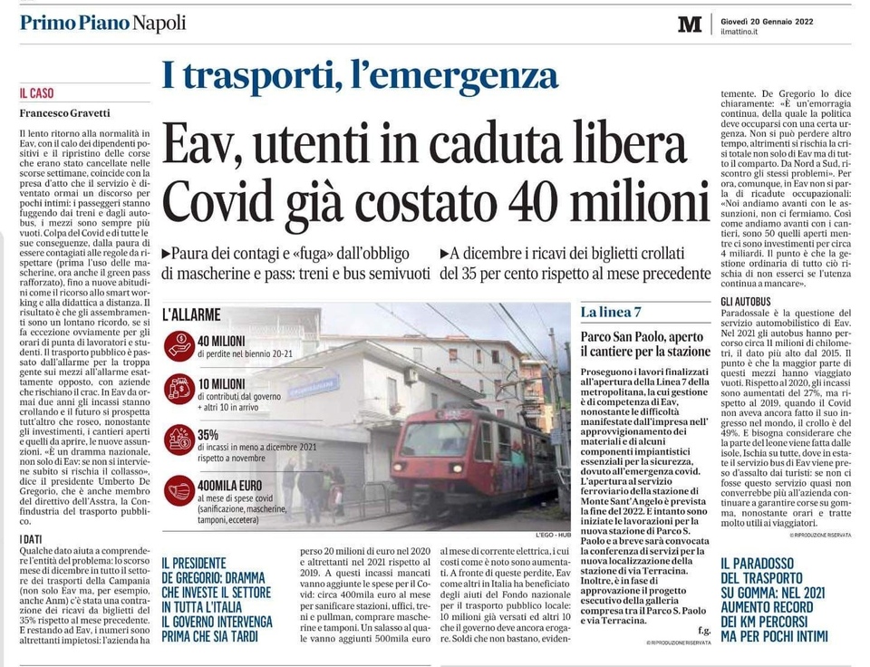 • EAV utenti in caduta libera, Covid già costato 40 milioni